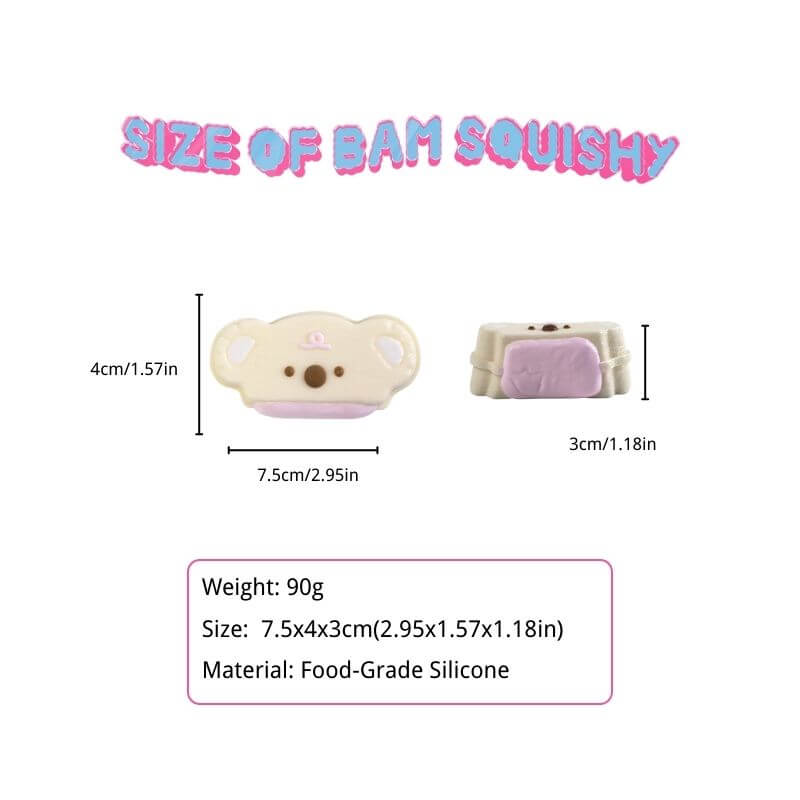 This cute koala-shaped slow-rise squishy features a plush, beige design with charming facial details (round eyes, a button nose, and a tiny white accent). Made from soft, durable material, it offers a satisfyingly slow rebound when squeezed—ideal for releasing tension at work, school, or home. Lightweight and portable, this koala Bam Squishy doubles as both a cute desk decor piece and a functional fidget toy for all ages.